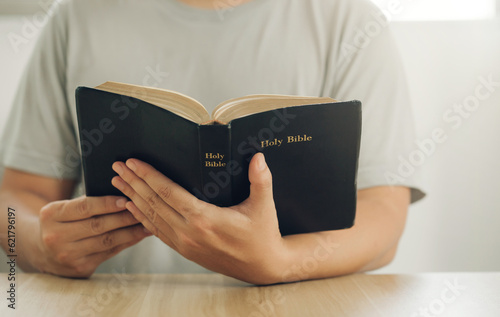Close-up of Christian man's hands while reading the Bible outside.Sunday readings, Bible education. spirituality and religion concept. Reading a book.