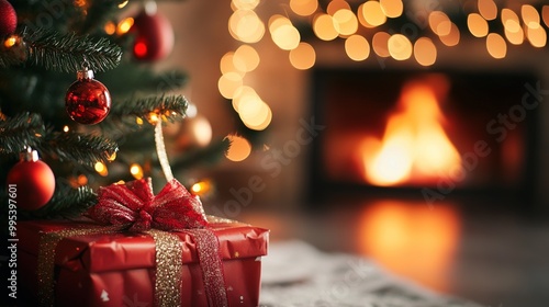 Close-Up of Christmas Tree and Gifts with Blurred Fireplace in the Background