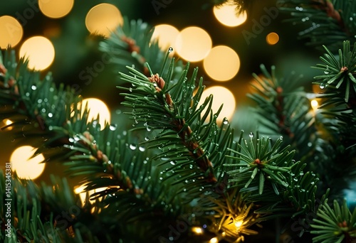 Close-up of Christmas tree branches with dewdrops and warm golden bokeh lights in the background, capturing the magic and beauty of the holiday season.