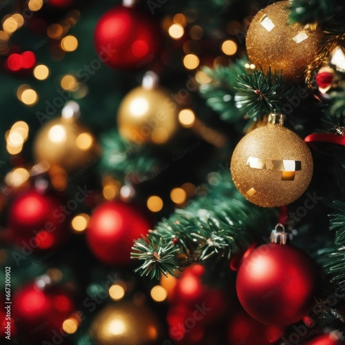 Close-UP of Christmas Tree, Red and Golden Ornaments against a Defocused Lights Background