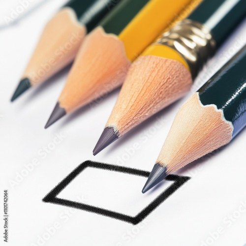 Close-up of colored pencils arranged above a checkbox illustration, symbolizing creativity and decision-making.
