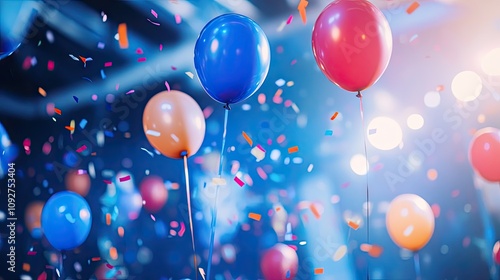 Close-up of colorful balloons and glittering confetti with a perfectly frosted birthday cake in the background, all on a bright canvas.