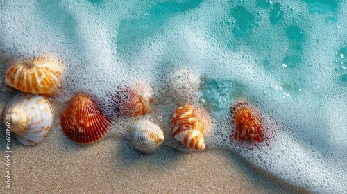 Close-up of colorful seashells on golden sand, foamy turquoise wave gently touching shore