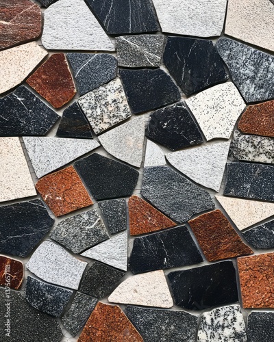 Close-up of colorful stone mosaic with irregular geometric shapes in black, white, gray, and rust tones, creating a textured abstract pattern. AI generative.