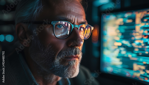 Close-Up of Computer Screen Reflection in Man's Glasses in Dark Room