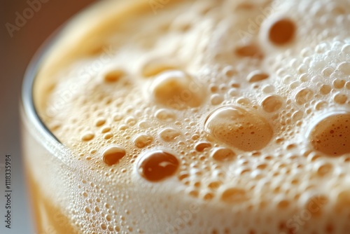 Close-up of condensation drops falling on a glass of frothy coffee, creating a visually appealing texture
