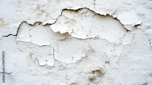 Close-up of cracked, peeling white paint on a textured surface.