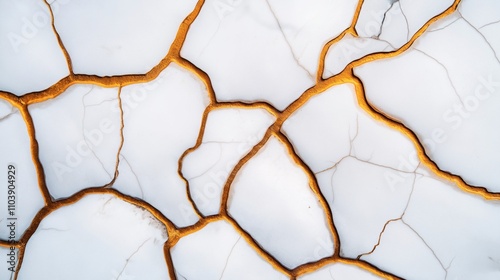 Close-up of cracked white surface with golden brown lines forming an abstract pattern resembling dried mud or desert earth.