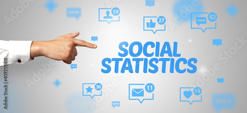 Close-Up of cropped hand pointing at SOCIAL STATISTICS inscription, social networking concept