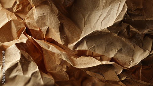 Close-up of crumpled brown paper texture, showing deep creases and shadows, suggesting rustic, organic, and natural feel, ideal for background or packaging design