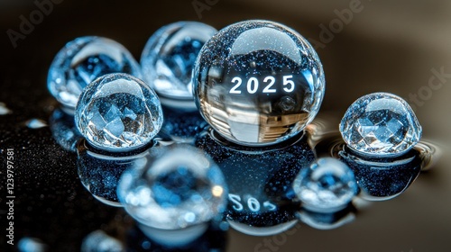 Close-up of crystal spheres reflecting 2025, symbolizing future and innovation.
