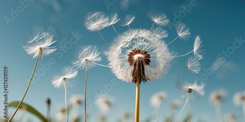 Close-up of dandelion seed heads with wispy seeds blowing away against a clear blue sky in a natural field setting