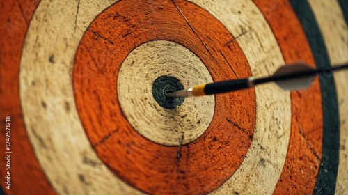 Close-Up of Dartboard with Arrow Hitting the Center of Red and White Target Symbolizing Business Goals Achievement and Focused Objectives