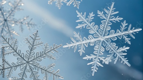 Close-up of delicate, intricate snowflakes against a soft blue background, showcasing natural ice crystal patterns in winter.