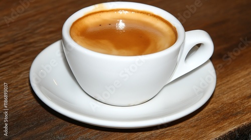 Closeup of Delicious Espresso in White Cup on Wooden Table : Generative AI