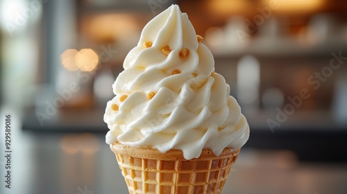 Close-Up of Delicious Vanilla Soft Serve Ice Cream in a Waffle Cone with Blurred Background in a Modern Cafe Setting