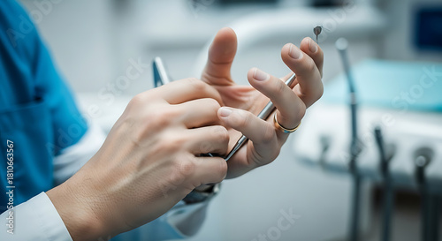 Close-up of dental professional's hands preparing sterile instruments in a modern clinic. Healthcare and dentistry concept.