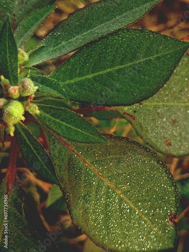 Closeup of dew drops like crystal on leaf of Euphorbia heterophylla