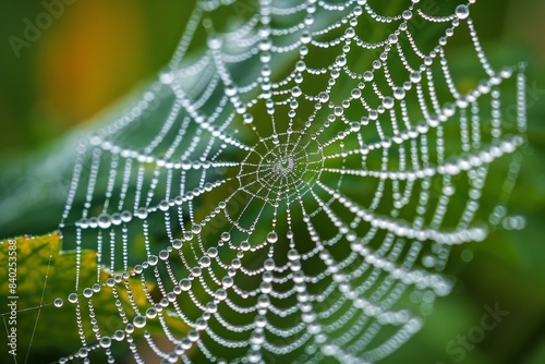 Close-up of dew drops on a spider web, showcasing nature's intricacy.