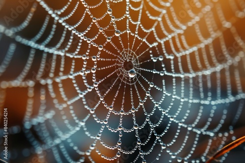 Close-up of dew drops on a spider web, showcasing nature's intricacy.