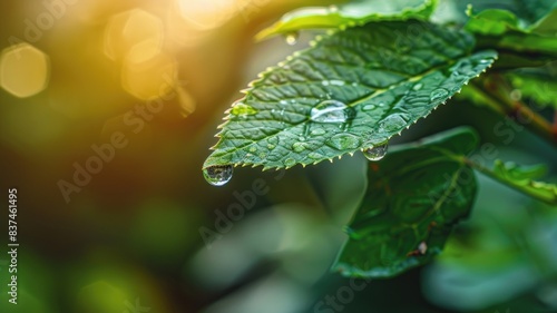 Close-up of dew drops on green leaf with blurred sunlight in background