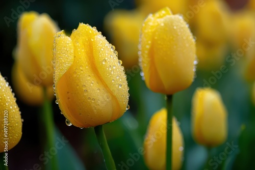 Closeup of Dew-Covered Yellow Tulips in Spring