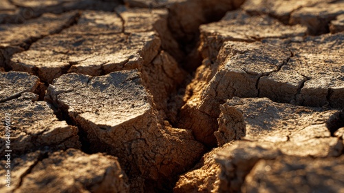 Close-up of dry, cracked soil where sunlight penetrates deep fissures, creating bright lines that refract slightly in the dusty air within.