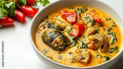 Close-up of egusi soup showing creamy texture and vibrant ingredients.