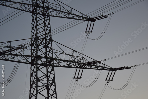 Close-up of electricity pylon structure with cables at blue hour after sunset, landscape format, symbol of energy and infrastructure in Germany.