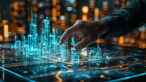 Close-up of engineers reviewing AI-driven smart city infrastructure plans, digital holograms visible