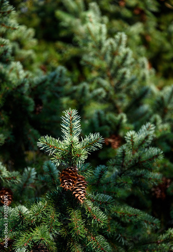 Closeup of evergreen branch with pinecones as a nature background, sunny day