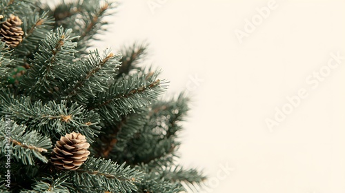 Closeup of Evergreen Pine Tree with Cones Against a Subtle Cream Background in Winter