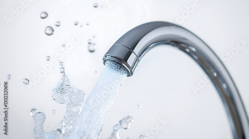 Close-Up of Faucet with High-Pressure Water Jet and Frozen Droplets – Isolated on White