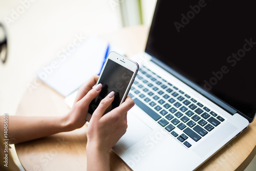 Close-up of female hands using smart phone while working on computer at modern office interior