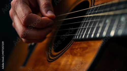 Close-up of fingers playing acoustic guitar strings. Perfect for music content, tutorials, album covers, or artistic concepts involving musicianship and sound