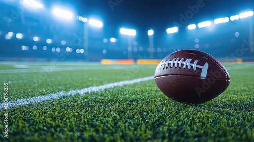Close-up of football on artificial turf under bright stadium lights, no players, with copy space