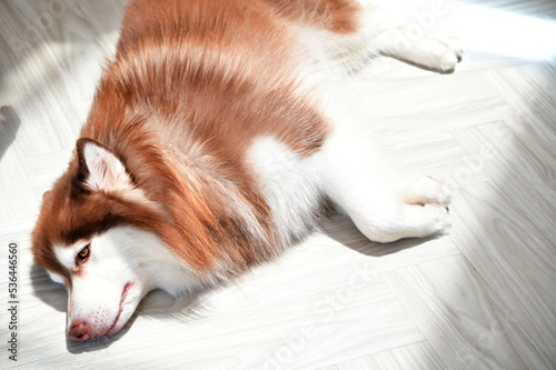 Closeup of Foreign Dogs Breeds lying on the cement floor Inside a pet shop in Thailand.