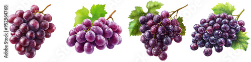 Close-up of four bunches of ripe purple grapes with green leaves, isolated on a white background, showcasing their vibrant color and fresh appearance.