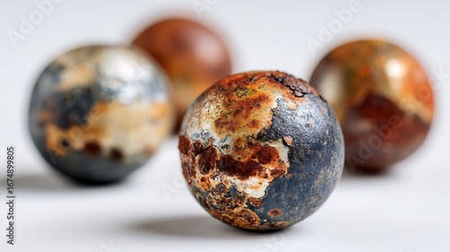 CloseUp of Four Weathered Metal Spheres Showing Rust and Color Variation on White