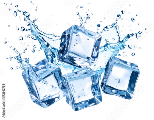“Close-Up of Fresh Ice Cubes Splashing in Water with Sparkling Effect, Isolated on a Transparent Background”