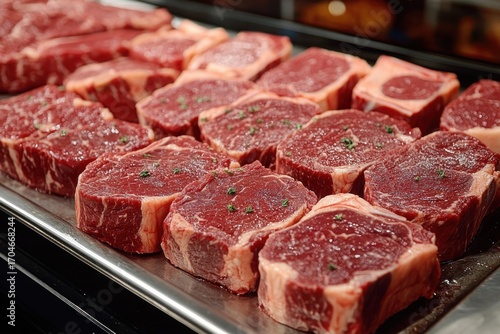 Close-up of fresh raw beef steak cuts neatly arranged on a metal tray with seasoning visible on the surface