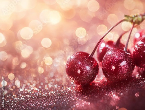 Close-up of fresh, red cherries with water droplets on a sparkling surface, bokeh background.