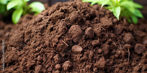 Closeup of Fresh Rich Brown Soil Texture with Green Plants in a Garden Setting