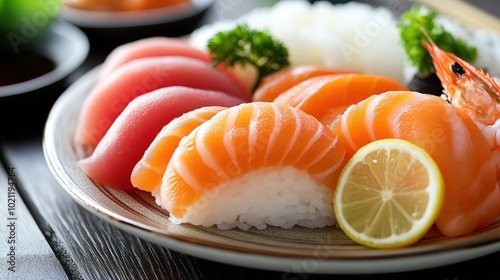 Close-up of fresh sushi platter featuring salmon and tuna sashimi with a slice of lemon on a wooden table.