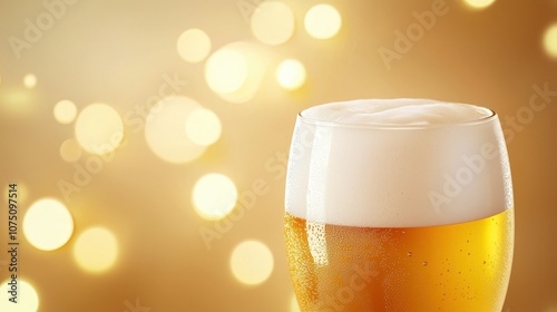 Close-up of frothy beer in a pint glass, bar lighting softly glowing in background.