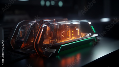Close-up of futuristic compact medical or laboratory devices, sleek design with translucent components and soft glowing lights, sharp focus on one unit with others blurred in the background
