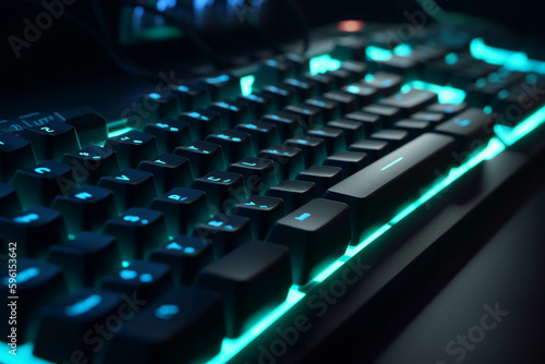 Close-up of gamer's keyboard with LED backlighting, Generative AI