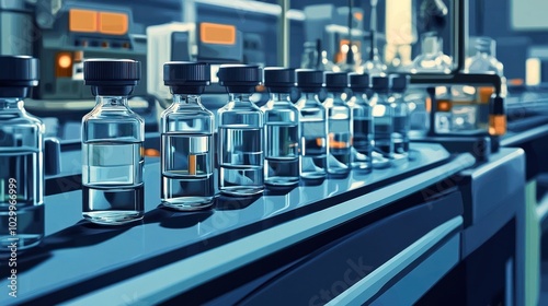 Close-up of glass bottles on a conveyor belt in a laboratory setting.