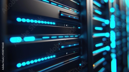 Close-up of glowing blue server racks in a high tech data center, showing detailed LED lights and digital panels, representing network infrastructure, computing systems, and modern data technology
