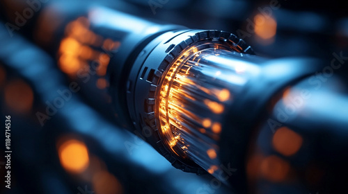 Close-up of glowing optical fiber cable radiating vibrant blue and white light against a sleek black background symbolizing data connectivity speed communication technology innovation and limitless po